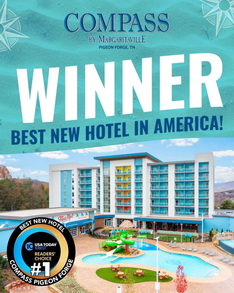 Each year, USA TODAY’s 10Best Readers’ Choice Awards highlight standout destinations across travel and hospitality. A panel of industry experts first selected 20 new hotels nationwide as finalists, and the public ultimately voted Compass Hotel by Margaritaville Pigeon Forge as the number one winner.
