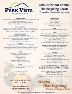 Celebrate Thanksgiving with a feast for the whole family at The Park Vista, A DoubleTree by Hilton! Join us on Thursday, November 27, 2025, for an unforgettable holiday meal served in the Tennessee Ballroom. Seating is available from 12:00 Noon to 7:00 PM.