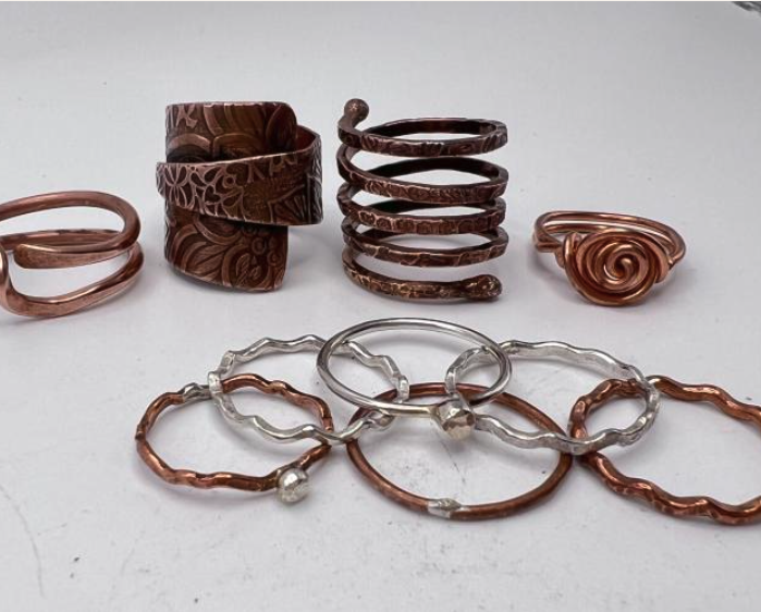 Participants will learn essential jewelry-making techniques including annealing, forging, texturing, and forming as they craft two styles of adjustable rings using copper and/or bronze. After mastering those skills, students will move on to basic soldering techniques to create stacking rings in copper and sterling silver.