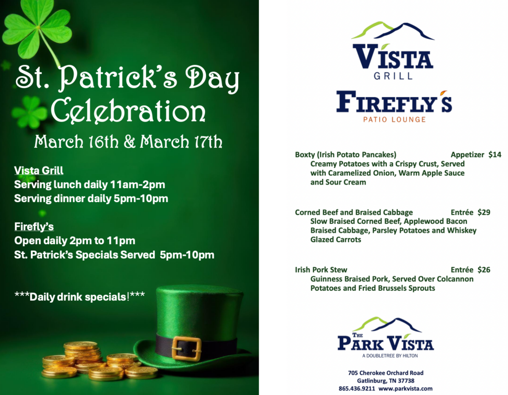 Located inside The Park Vista – a DoubleTree by Hilton Hotel, The Park Vista Grill offers stunning mountain views alongside delicious dining. For St. Patrick’s Day, guests can enjoy seasonal food and drink specials in a relaxed, scenic setting. It’s the perfect spot for those looking to celebrate with classic flavors while overlooking the Smoky Mountains. Whether you’re visiting for lunch or dinner, this elevated dining experience adds a little extra charm to your holiday plans.